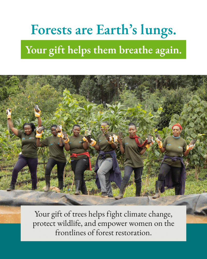 Your gift helps rebuild forests in Kenya, where farmers plant and protect native trees that will grow for decades. The trees are planted under contract with the Kenyan Forest Service to help reforest 5.1 million hectares, a significant component of Kenya’s Nationally Determined Contribution (NDC) under the Paris Agreement (PDF). These trees will capture carbon, restore ecosystems, and revitalize degraded land — all while supporting local communities. No logging. No gimmicks. Just lasting impact.